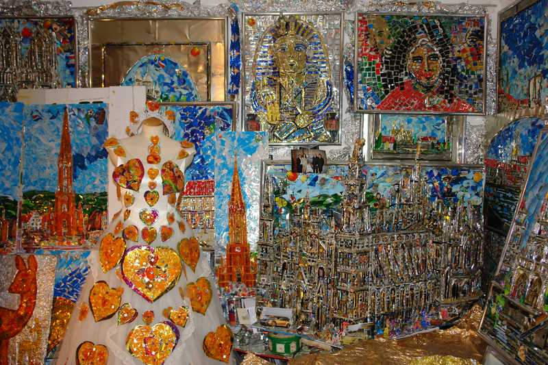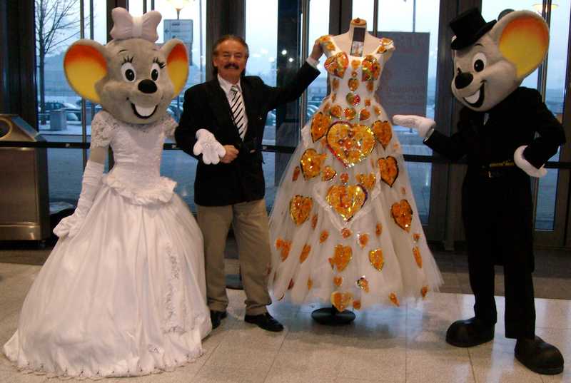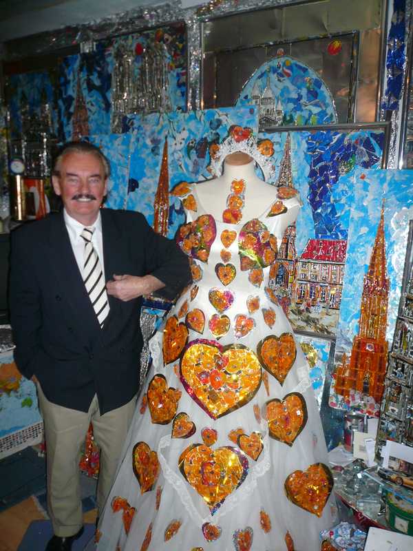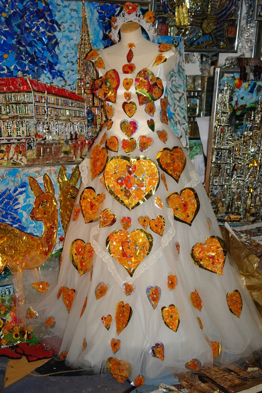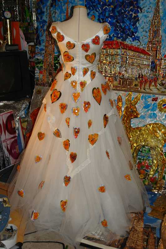 Brautkleid mit Herzen aus Katzenaugen dekoriert.