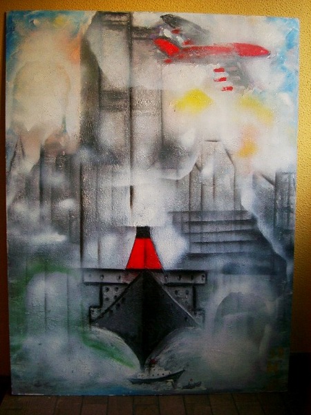 Düstere Viktion vom Crash im WTC in New York lange vor dem 11. September gemalt und gesprayt. Meine Sorge war, dass Terroristen das WTC mit einem Schiff voller Benzin oder mit einem Flugzeug oder einem Ballon voller Dynamit angreifen werden. Leider hat sich diese Vision erfüllt.
